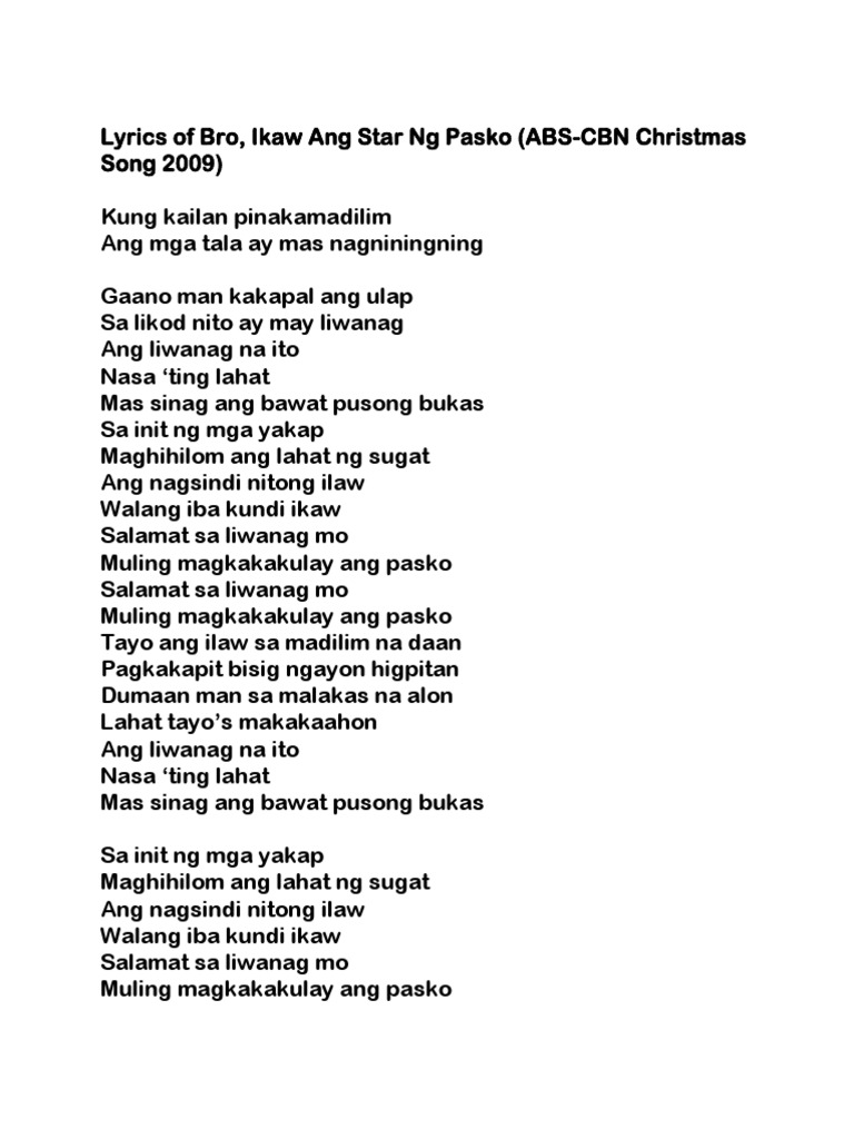 Star Ng Pasko - Kapamilya Stars 2009 Muling magkakakulay ang pasko Kung kailan pinakamadilim Ang mga tala ay mas nagniningning Kikislap ang pag-asa Gaano man kakapal ang ulap Kahit kanino man Sa likod nito ay may liwanag Dahil ikaw Bro dahil ikaw Bro Ang liwanag na ito Dahil ikaw Bro Nasa ting lahat Ang star ng pasko May sinag ang bawat pusong bukas Sa. Maghihilom ang lahat ng sugat Ang nagsindi nitong ilaw Walang iba kundi ikaw Salamat sa liwanag mo Muling magkakakulay ang pasko Salamat sa liwanag mo Muling magkakakulay ang pasko Tayo ang ilaw sa madilim na daan Pagkakapit bisig lalong higpitan Dumaan man sa malakas na alon Lahat tayoy makakaahon Ang liwanag na ito Nasa ting lahat May sinag ang. Maghihilom ang lahat ng sugat Ang nagsindi nitong ilaw.