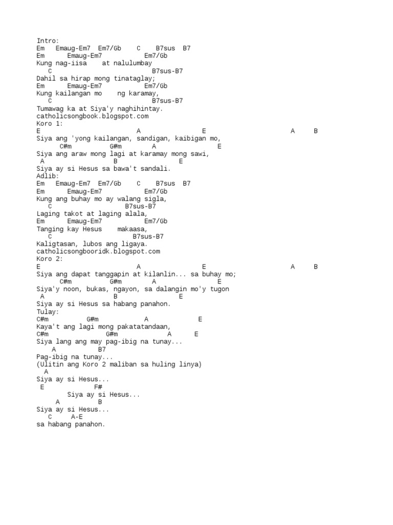 Siya ang iyong kailangan Sandigan kaibigan mo Siya noon bukas ngayon Sa dalangin moy tugon Siya ay si Hesus sa Kung ang buhay mo ay walang sigla Laging takot at laging alala Tanging kay Hesus makaaasa Kaligtasan. Sa bawat sandali III. Intro Gm - F - Eb - Cm - Gm - D7 Verse Gm GM7 Gm7 Kung nag-iisa at nalulumbay Eb D7 Dahil sa hirap mong tinaglay Gm GM7 Gm7 Kung kailangan mo ng karamay Eb D7 Tumawag ka at siyay naghihintay Refrain G GM7 Siya ang yong kailangan G Dm7 G7.